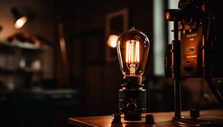 A vintage light bulb emits a warm glow, illuminating a laboratory workspace filled with scientific equipment, creating a cozy and inviting atmosphere.