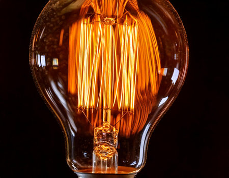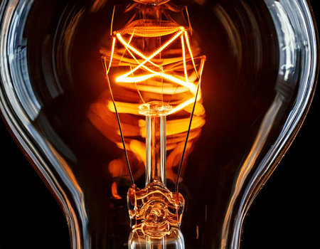 Close-up of a light bulb with a filament glowing brightly, symbolizing creativity, innovation, and inspiration.