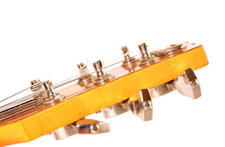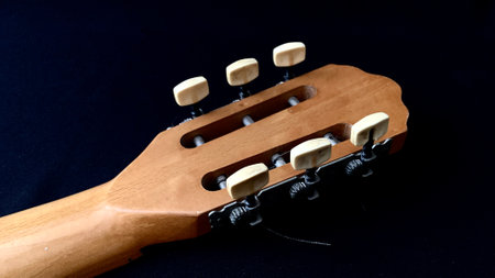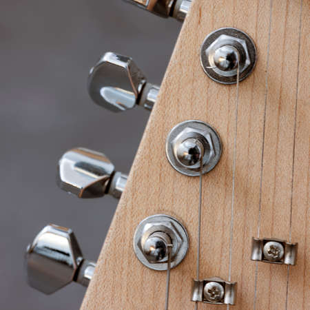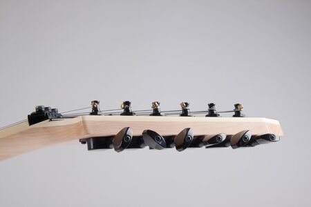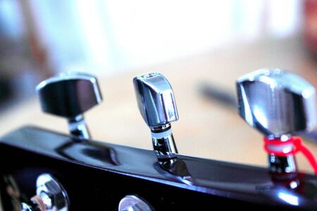 Guitar Head and Tuning Keys Close Up Photo. Music and Entertainment Industry Theme.