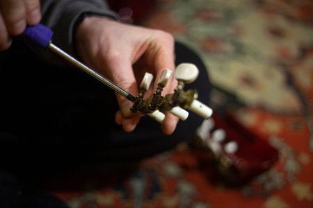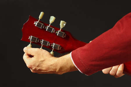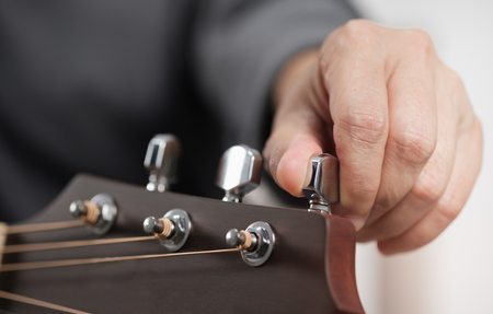 close-up of a male hand twisting the tuning pegs on a guitar neck