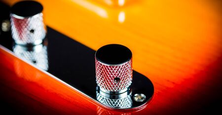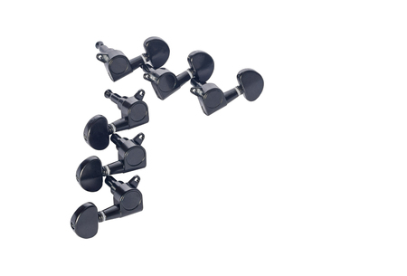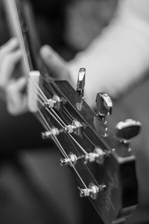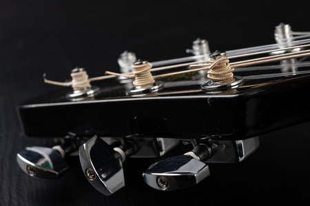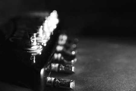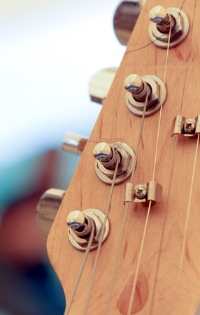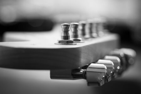 Guitar headstock close-up. Guitar pegs black and white. Retro stylized with shallow depth of field