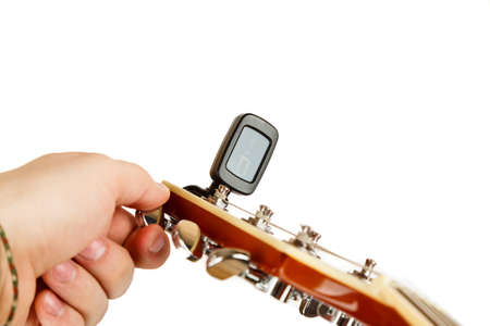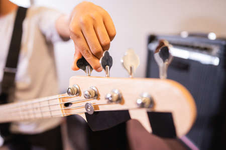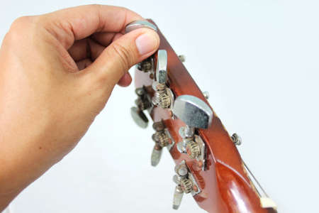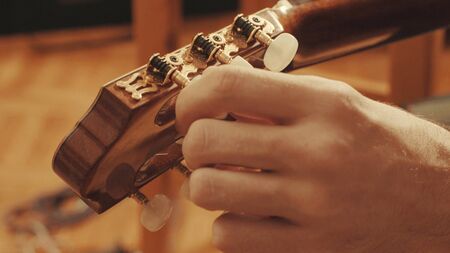 Mans hand tuning a guitar. Vintage colors. Light wooden natural background.