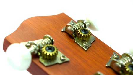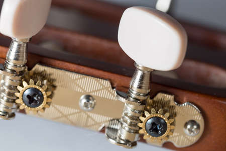 Acoustic guitar details. Guitar neck backside, tuning pegs