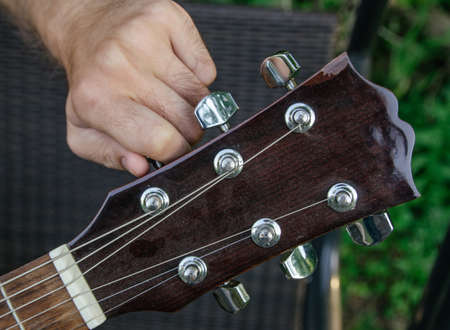 Fingers turning the tuning pegs and gears of the headstock of an acoustic guitar. Tuning the guitar. Details of the head of an old acoustic guitar.