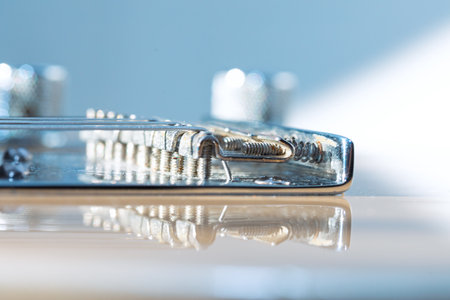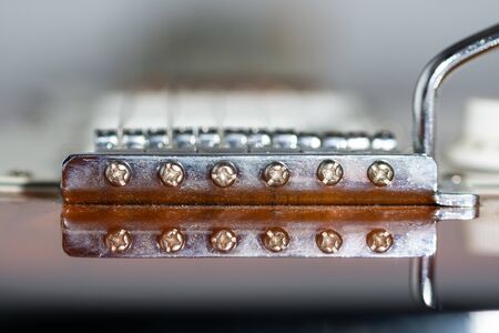Electric guitar bridge reveals coiled strings anchored to gleaming metal. Reflections highlight instrument mechanical precision and musical craftsmanship. String saddles and guitar bridge assembly