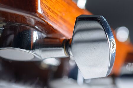 Close-up macro shot of a tuning peg with a string tuning knob on an acoustic guitar. Selective focus. Acoustic instrument concept. Low key.