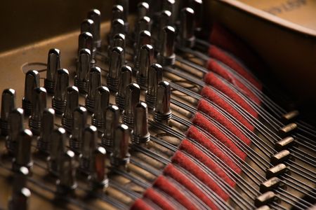 Detail of the interior of a piano with the soundboard, strings and pins.