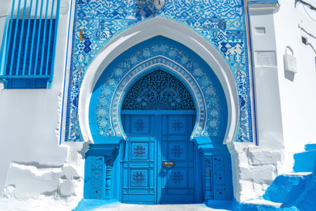 This stunning image showcases a colorful Moroccan doorway, adorned with intricate patterns and vibrant tiles, representing the rich cultural heritage of the region.