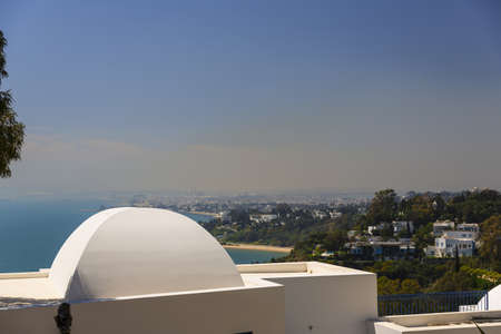 blue white city, city of artists and lovers Sidi Bou Said, view of the minaret of the mosque, buildings and the bay of the ancient city of Carthage