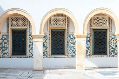 Intricate arches frame colorful patterned windows in a serene historic location showcasing traditional architecture and design elements.