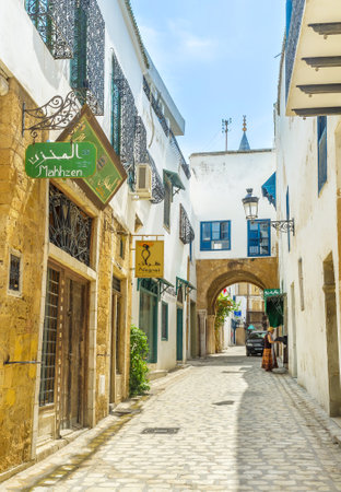 TUNIS, TUNISIA - DECEMBER 30 2019: Typical cobbled and narrow street with colorful doors, columns and arcades inside the historical medina of Tunis