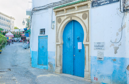 TUNIS, TUNISIA - AUGUST 30, 2015: The narrow street of Medina with the scenic arabic door, on August 30 in Tunis.