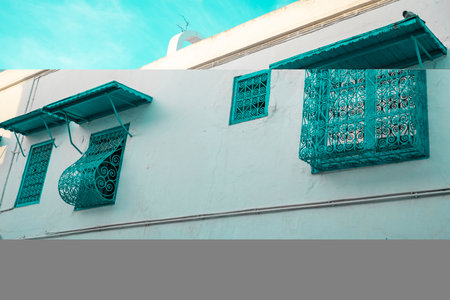 White-blue city of Sidi Bou Said, Tunisia. Eastern fairy tale with a French charm. View of an old historic building, Sidi Bou Said Carthage, Tunisia.