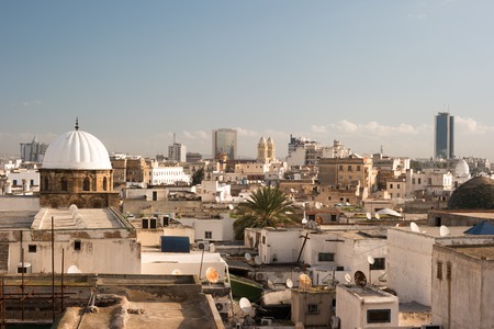 View of the Al-Zaytuna Mosque and the skyline of Tunis at dawn.