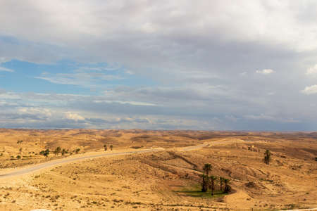 Road through the sand dunes of the Sahara Desert in Tunisia. Landscape with blue sky, yellow sand and green oasis with palm trees