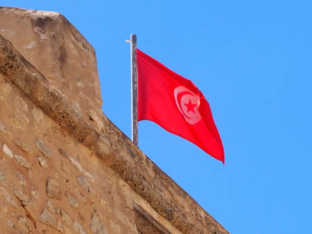 Red Tunisian national flag waves against administrative building in Sousse city. All government buildings must have flags on facade. Tunisia, the Africa