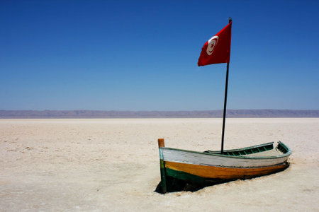Abandoned lonely boat with Tunisia flag in solonchak