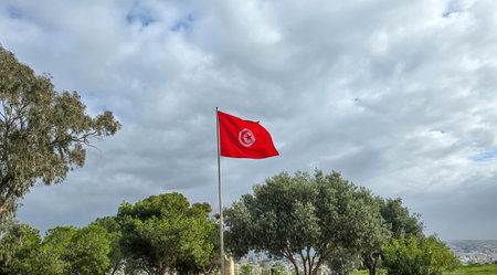 Tunisian flag waving among green trees under a cloudy sky