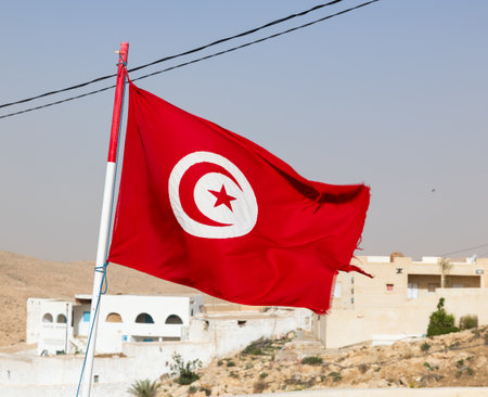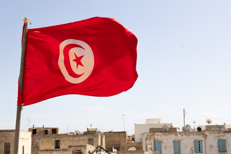 Flag of Tunisia waving against background of stone houses during daytime