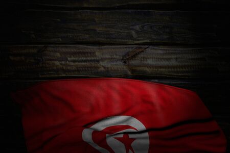- dark picture of Tunisia flag with large folds on old wood with free place for your content