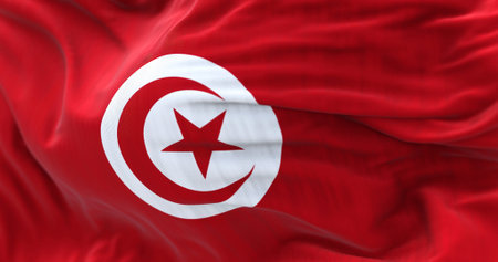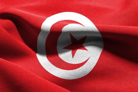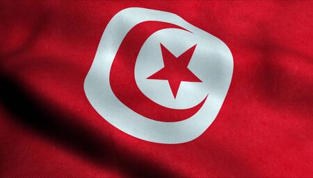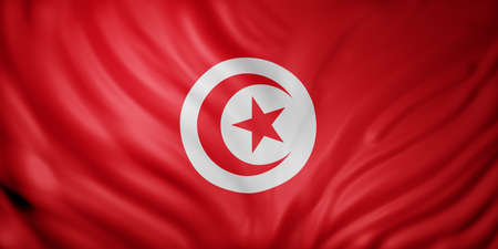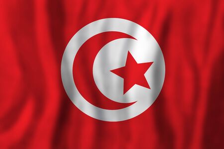 Close-up view of the Tunisia national flag waving in the wind. The Republic of Tunisia is the northernmost country in Africa. Fabric textured background. Selective focus. 3d illustration