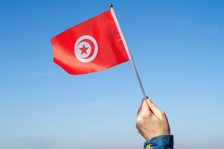 Detail of the national flag of Tunisia waving in the wind on a clear day. Democracy and politics. Patriotism. Maghreb country in north Africa. Selective focus.