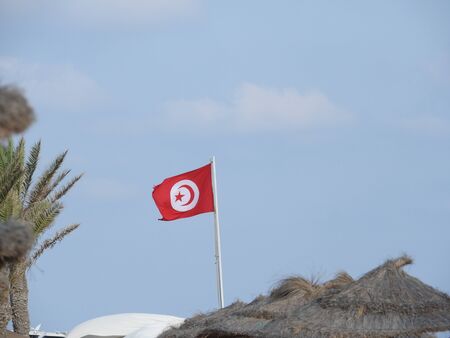 Flag of Tunisia near palm trees on the beach.