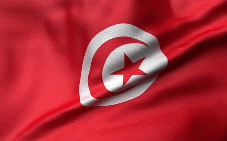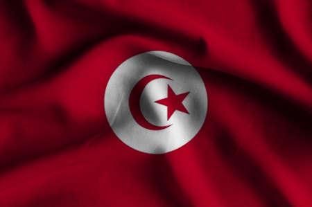 3D illustration closeup flag of Tunisia. Waving on the wind flag textile background