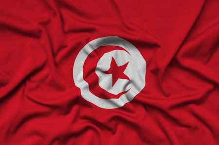 Tunisia flag is depicted on a sports cloth fabric with many folds. Sport team waving banner