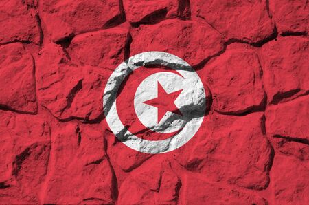 Tunisia flag depicted in paint colors on old stone wall close up. Textured banner on rock wall background