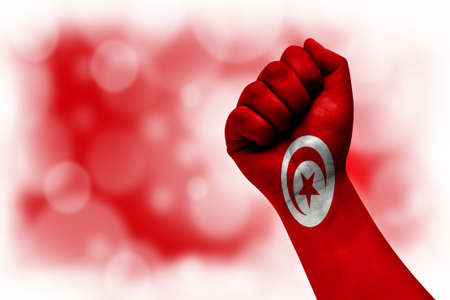 Flag of Tunisia painted on male fist, strength, power, concept of conflict. On a blurred background.