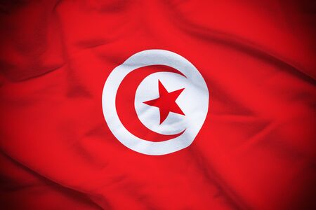 Fabric flag of Tunisia. Crease of Tunisian flag background, red and white flag with star and crescent in center.