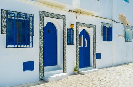 Sidi Bou Said - typical building with white walls, blue doors and windows, Tunisia