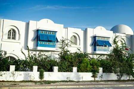 blue Windows and white walls of houses in Tunisia against a background of blue sky and bright sunlight. there are green plants on the street