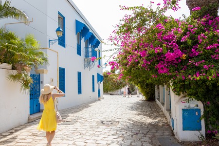 SIDI BOU SAID, TUNISIA - JULY 19, 2018: A woman in yellow dress walking in a city street in Sidi Bou Said, Tunisia, Africa