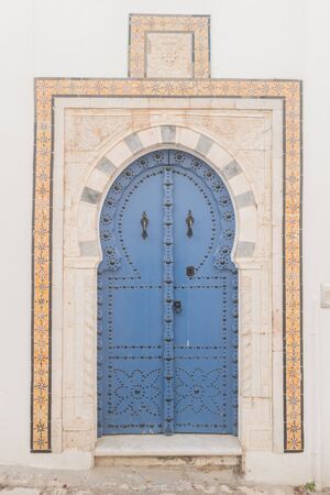 Beautiful ornamental blue door of so typical shape for Tunisia