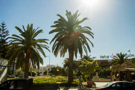 Date palm tree with date fruits against blue sky and airport Monastir, Tunisia background 09 october 2018