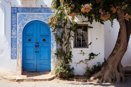 Sidi Bou Said. Tunisia. Houses and streets of the magical blue and white city. view through the arch on the door and yard