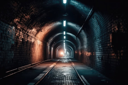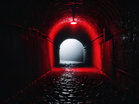 Flickering emergency light illuminates a dark subway tunnel, creating a mysterious and eerie atmosphere