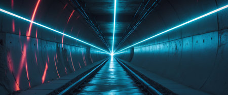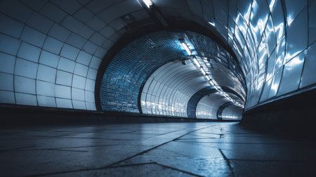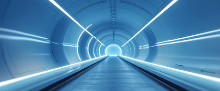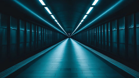 A captivating view of a futuristic underground subway tunnel featuring striking blue neon lights, symmetrical lines, and an empty path that creates a sense of depth and tranquility.