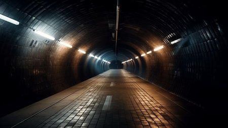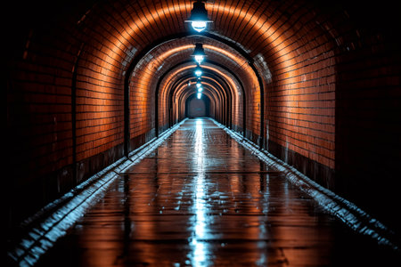 Empty tunnel made of bricks with lights illuminating wet pavement