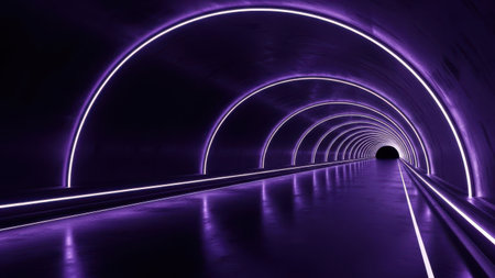 The image depicts a long, curved tunnel illuminated with vibrant purple lights. The tunnel walls are lined with evenly spaced, glowing light fixtures that create a mesmerizing pattern of arches. The perspective is from the entrance, looking towards the vanishing point at the end of the tunnel, giving a sense of depth and infinity.