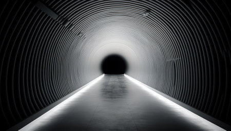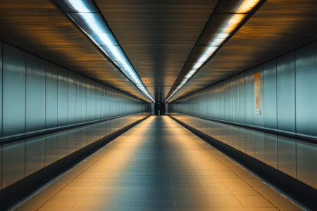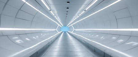 The image captures a symmetrical view of an empty tunnel with a vanishing point perspective. The tunnel is illuminated by a series of fluorescent lights running along the center of its ceiling