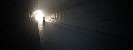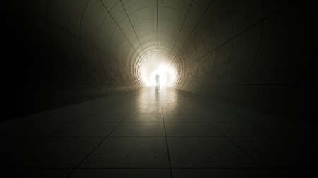 Concept or conceptual dark tunnel with a bright light at the end or exit as metaphor to success, faith, future or hope, a black silhouette of walking man to new opportunity or freedom 3d illustration