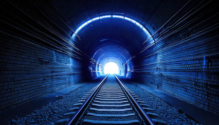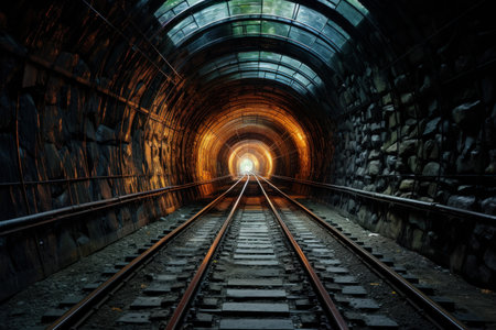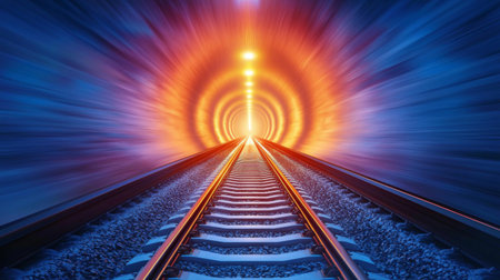 A mesmerizing view of train tracks extending toward a glowing tunnel of light, creating a sense of movement and depth, ideal for exploration themes in various projects.