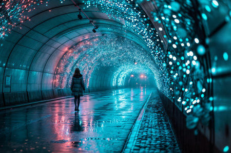 Woman walking in an illuminated tunnel with blue and pink lights at night