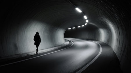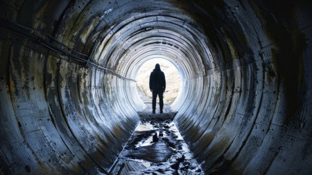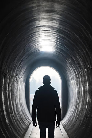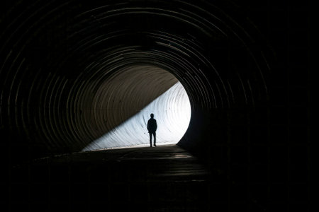 A person standing at the end of a dark tunnel, looking hesitant to move forward