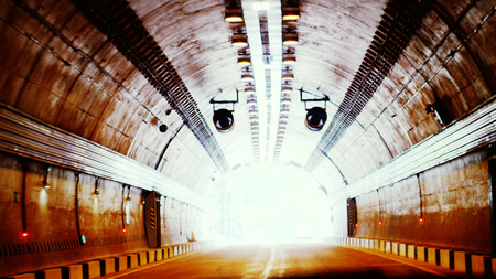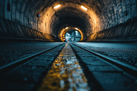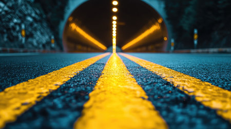 Yellow traffic lines leading to a tunnel entrance, with the tunnel lights glowing in the distance, creating a sense of journey