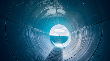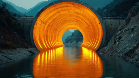 Dramatic angle captures vast sewage tunnel filled flowing water artificial yellow lights reflect off surface, enhancing industrial and futuristic atmosphere