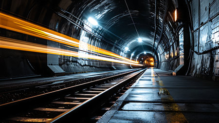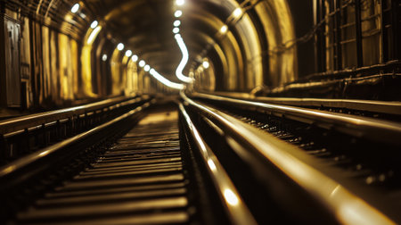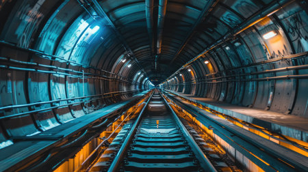 A captivating view of a subway tunnel featuring curved tracks bathed in ambient light, illustrating the dynamic and mysterious essence of urban transportation.